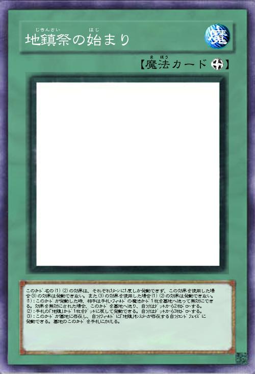 | このカード名の(1)(2)の効果は、それぞれ1ターンに1度しか発動できず、この効果を使用した場合(3)の効果は発動できない。また(3)の効果を使用した場合(1)(2)の効果は発動できない。 (1):このカードが発動した時、相手は手札・フィールドの魔法カード1枚を墓地へ送って無効にできる。効果を無効にされた場合、このカードを墓地へ送り、自分はデッキから2枚ドローする。 (2):手札の「地鎮」カード1枚をデッキに戻して発動できる。自分はデッキから3枚ドローする。 (3):このカードが墓地に存在し、自分フィールドに「地鎮」モンスターが存在する自分エンドフェイズに発動できる。墓地のこのカードを手札に加える。 | |||
