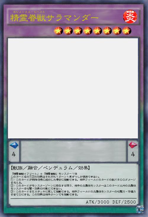 | 「精霊眷獣イフリート」+「精霊眷獣」モンスター1体 このカード名の①③の効果はそれぞれ1ターン1度ずつしか使用できない。 ①:このカードが特殊召喚に成功した場合に発動できる。相手フィールドのカードの数×500ダメージを与える。 ②:このカードがモンスターゾーンに存在する限り、相手の炎属性モンスターはこのカード以外の炎属性モンスターを攻撃・効果の対象にできない。 ③:このカードをEXデッキに戻して発動できる。相手フィールドの炎属性モンスターの攻撃力・守備力を全て0にする。この効果は相手ターンでも発動できる。 | |||