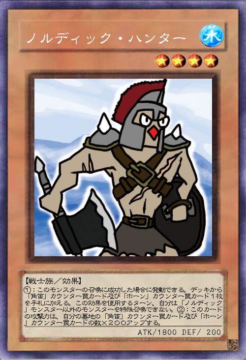 「「角笛」をサポートするモンスターです。「落とし穴」をサポートする「蟲惑魔」があるのだから、「角笛」サポートがあっても良いだろう…という事で。そして角笛といえば北欧…という事で「ノルディック」カテゴリというのを考えました。