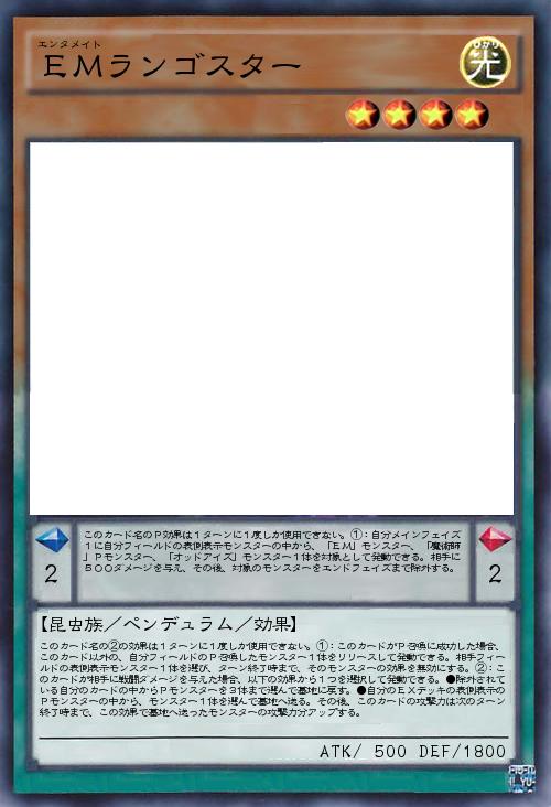 | このカード名のP効果は1ターンに1度しか使用できない。①:自分メインフェイズ1に自分フィールドの表側表示モンスターの中から、「EM」モンスター、「魔術師」Pモンスター、「オッドアイズ」モンスター1体を対象として発動できる。相手に500ダメージを与え、その後、対象のモンスターをエンドフェイズまで除外する。 | |||