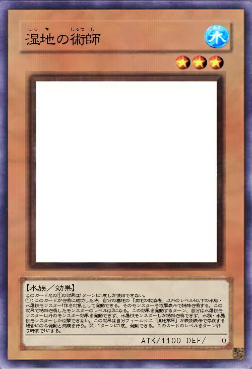 | このカード名の①の効果は1ターンに1度しか使用できない。 ①:このカードが召喚に成功した時、自分の墓地の「湿地の救済者」以外のレベル4以下の水族・水属性モンスター1体を対象として発動できる。そのモンスターを攻撃表示で特殊召喚する。この効果で特殊召喚したモンスターのレベルは2になる。この効果を発動するターン、自分は水属性モンスター以外のモンスター効果を発動できず、水属性モンスターしか特殊召喚できず、水族・水属性モンスターしか攻撃できない。この効果は自分フィールドに「湿地草原」が表側表示で存在する場合にのみ発動と処理を行う。②:1ターンに1度、発動できる。このカードのレベルをターン終了時まで1にする。 | |||