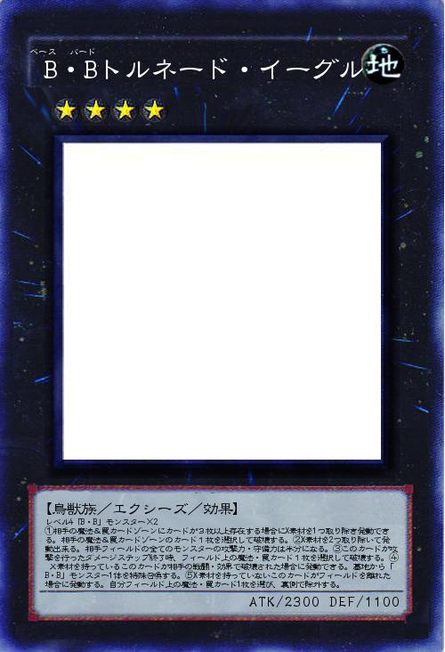 | レベル4「B・B」モンスター×2 ①相手の魔法&罠カードゾーンにカードが3枚以上存在する場合にX素材を1つ取り除き発動できる。相手の魔法&罠カードゾーンのカード1枚を選択して破壊する。②X素材を2つ取り除いて発動出来る。相手フィールドの全てのモンスターの攻撃力・守備力は半分になる。③このカードが攻撃を行ったダメージステップ終了時、フィールド上の魔法・罠カード1枚を選択して破壊する。④ X素材を持っているこのカードが相手の戦闘・効果で破壊された場合に発動できる。墓地から「B・B」モンスター1体を特殊召喚する。⑤X素材を持っていないこのカードがフィールドを離れた場合に発動する。自分フィールド上の魔法・罠カード1枚を選び、裏側で除外する。 | |||