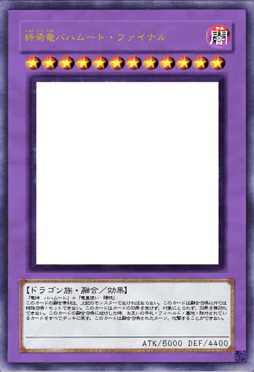 「竜神 バハムート」+「竜皇使い 陽明」 このカードの融合素材は、上記のモンスターでなければならない。このカードは融合召喚以外では特殊召喚・セットできない。このカードはカードの効果を受けず、対象にとられず、効果を無効化できない。このカードの融合召喚に成功した時、お互いの手札・フィールド・墓地・除外されているカードをすべてデッキに戻す。このカードは融合召喚されたターン、攻撃することができない。 |