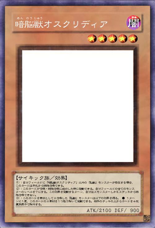 | (1):自分フィールドに「暗脳獣オスクリディア」以外の「脳獣」モンスターが存在する場合、このカードは手札から特殊召喚できる。 (2):このカードが召喚・特殊召喚に成功した時に発動できる。自分フィールドの全てのモンスターのレベルを7にする。この効果を発動するターン、自分はXモンスターしかEXデッキから特殊召喚できない。 (3):このカードを素材としてX召喚した「脳獣」モンスターは以下の効果を得る。 ● 1ターンに1度、このカードのX素材を1つ取り除いて発動できる。相手のデッキの上からカードを4枚裏側表示で除外する。 | |||