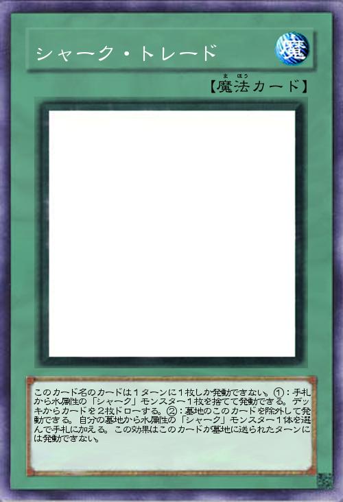 | このカード名のカードは1ターンに1枚しか発動できない。①:手札から水属性の「シャーク」モンスター1枚を捨てて発動できる。デッキからカードを2枚ドローする。②:墓地のこのカードを除外して発動できる。自分の墓地から水属性の「シャーク」モンスター1体を選んで手札に加える。この効果はこのカードが墓地に送られたターンには発動できない。 | |||