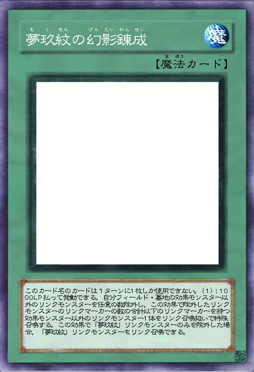 | このカード名のカードは1ターンに1枚しか使用できない。(1):1000LP払って発動できる。自分フィールド・墓地の効果モンスター以外のリンクモンスターを任意の数除外し、この効果で除外したリンクモンスターのリンクマーカーの数の合計以下のリンクマーカーを持つ効果モンスター以外のリンクモンスター1体をリンク召喚扱いで特殊召喚する。この効果で「夢玖紋」リンクモンスターのみを除外した場合、「夢玖紋」リンクモンスターもリンク召喚できる。 | |||