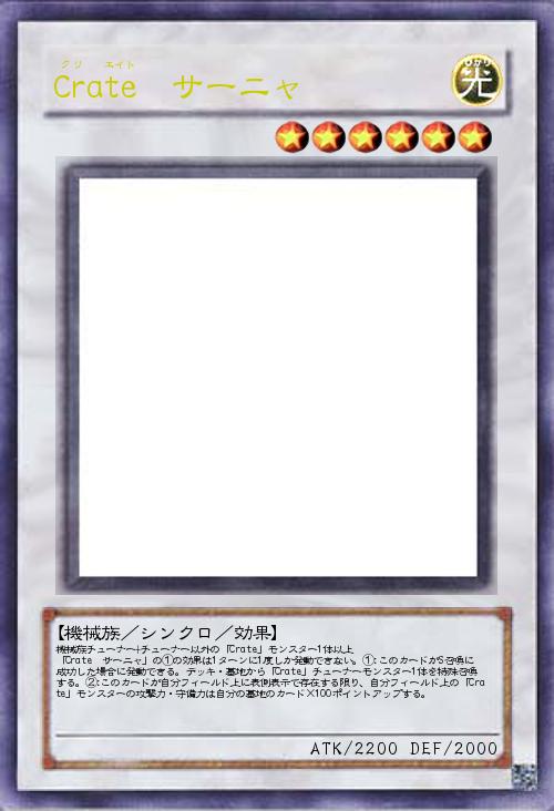 | 機械族チューナー+チューナー以外の「Crate」モンスター1体以上 「Crate サーニャ」の①の効果は1ターンに1度しか発動できない。①:このカードがS召喚に成功した場合に発動できる。デッキ・墓地から「Crate」チューナーモンスター1体を特殊召喚する。②:このカードが自分フィールド上に表側表示で存在する限り、自分フィールド上の「Crate」モンスターの攻撃力・守備力は自分の墓地のカード×100ポイントアップする。 | |||