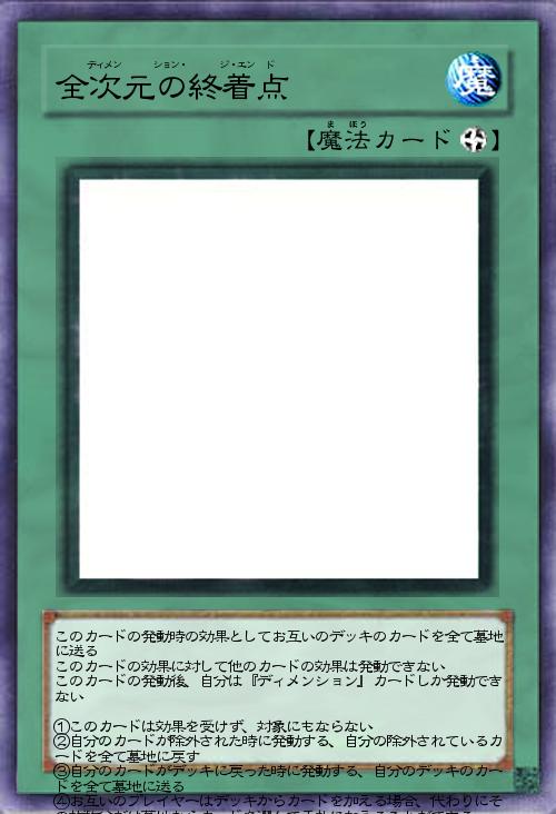 | このカードの発動時の効果としてお互いのデッキのカードを全て墓地に送る このカードの効果に対して他のカードの効果は発動できない このカードの発動後、自分は『ディメンション』カードしか発動できない ①このカードは効果を受けず、対象にもならない ②自分のカードが除外された時に発動する、自分の除外されているカードを全て墓地に戻す ③自分のカードがデッキに戻った時に発動する、自分のデッキのカードを全て墓地に送る ④お互いのプレイヤーはデッキからカードを加える場合、代わりにその枚数分だけ墓地からカードを選んで手札に加えることができる | |||