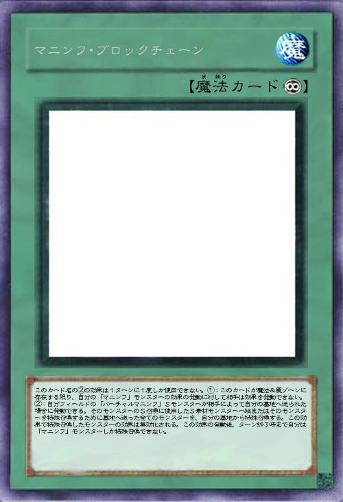 | このカード名の②の効果は1ターンに1度しか使用できない。①:このカードが魔法&罠ゾーンに存在する限り、自分の「マニンフ」モンスターの効果の発動に対して相手は効果を発動できない。②:自分フィールドの「バーチャルマニンフ」Sモンスターが相手によって自分の墓地へ送られた場合に発動できる。そのモンスターのS召喚に使用したS素材モンスター一組またはそのモンスターを特殊召喚するために墓地へ送った全てのモンスターを、自分の墓地から特殊召喚する。この効果で特殊召喚したモンスターの効果は無効化される。この効果の発動後、ターン終了時まで自分は「マニンフ」モンスターしか特殊召喚できない。 | |||