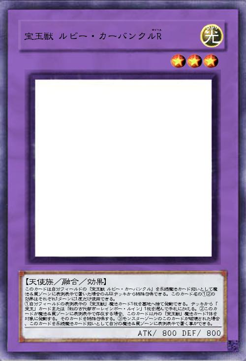 | このカードは自分フィールドの「宝玉獣 ルビー・カーバンクル」を永続魔法カード扱いとして魔法&罠ゾーンに表側表示で置いた場合のみEXデッキから特殊召喚できる。このカード名の①②の効果はそれぞれ1ターンに1度だけ使用できる。 ①自分フィールドの表側表示の「宝玉獣」魔法カード1枚を墓地へ捨て発動できる。デッキから「宝玉」カードまたは「虹の古代都市-レインボー・ルイン」1枚を選んで手札に加える。②このカードが魔法&罠ゾーンに表側表示で存在する場合、このカード以外の「宝玉獣」魔法カード1体を対象に発動する。そのカードを特殊召喚する。③モンスターゾーンのこのカードが破壊された場合、このカードを永続魔法カード扱いとして自分の魔法&罠ゾーンに表側表示で置く事ができる。 | |||