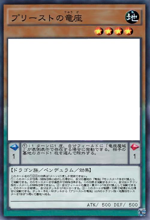 | このカード名の①②③の効果は1ターンに1度しか使用できない。 ①:このカードが召喚・特殊召喚に成功した場合に、自分の墓地の「竜座」Pモンスター1体を対象として発動できる。そのモンスターを守備表示で特殊召喚する。この効果を発動するターン、自分はドラゴン族モンスターしか特殊召喚できない。②:自分フィールドの魔法・罠カード1枚を対象として発動できる。そのカードを破壊し、自分はデッキから1枚ドローする。③:このカードが戦闘・効果で破壊された場合に発動できる。デッキ・手札・EXデッキから「プリーストの竜座」以外のドラゴン族・地属性モンスターを1体ずつ選んで墓地へ送る。 | |||