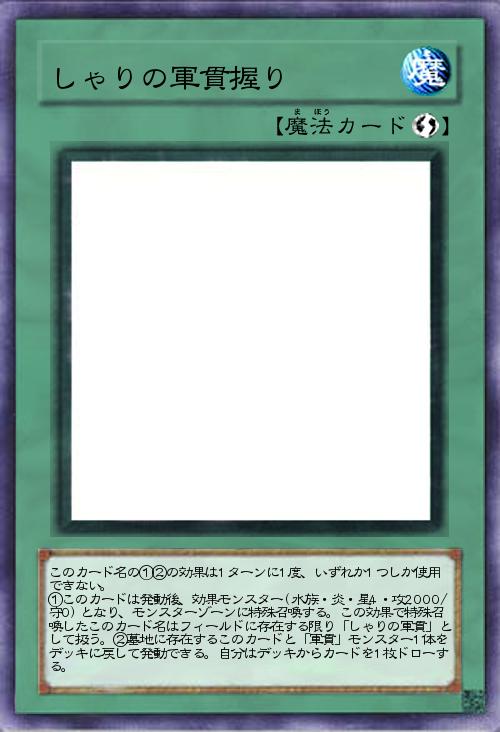 | このカード名の①②の効果は1ターンに1度、いずれか1つしか使用できない。 ①このカードは発動後、効果モンスター(水族・炎・星4・攻2000/守0)となり、モンスターゾーンに特殊召喚する。この効果で特殊召喚したこのカード名はフィールドに存在する限り「しゃりの軍貫」として扱う。②墓地に存在するこのカードと「軍貫」モンスター1体をデッキに戻して発動できる。自分はデッキからカードを1枚ドローする。 | |||