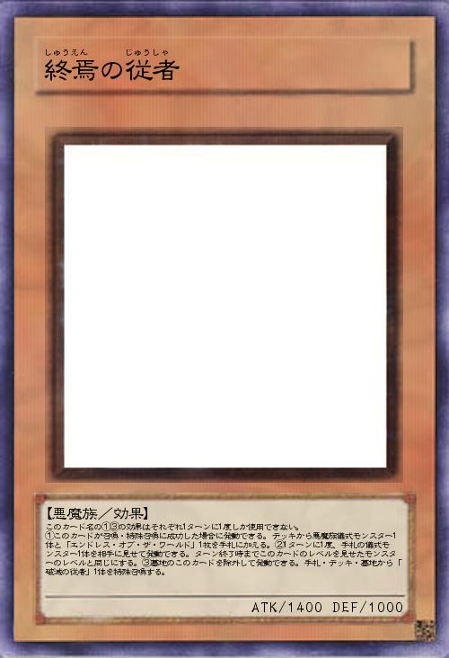 | このカード名の①③の効果はそれぞれ1ターンに1度しか使用できない。 ①このカードが召喚・特殊召喚に成功した場合に発動できる。デッキから悪魔族儀式モンスター1体と「エンドレス・オブ・ザ・ワールド」1枚を手札に加える。②1ターンに1度、手札の儀式モンスター1体を相手に見せて発動できる。ターン終了時までこのカードのレベルを見せたモンスターのレベルと同じにする。③墓地のこのカードを除外して発動できる。手札・デッキ・墓地から「破滅の従者」1体を特殊召喚する。 | |||