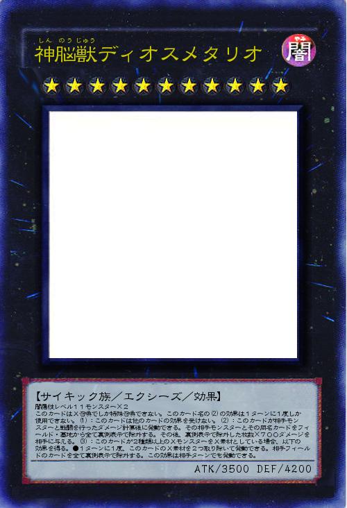 | 闇属性レベル11モンスター×2 このカードはX召喚でしか特殊召喚できない。このカード名の(2)の効果は1ターンに1度しか使用できない。(1):このカードは他のカードの効果を受けない。(2):このカードが相手モンスターと戦闘を行ったダメージ計算後に発動できる。その相手モンスターとその同名カードをフィールド・墓地から全て裏側表示で除外する。その後、裏側表示で除外した枚数×700ダメージを相手に与える。(3):このカードが2種類以上のXモンスターをX素材としている場合、以下の効果を得る。●1ターンに1度、このカードのX素材を2つ取り除いて発動できる。相手フィールドのカードを全て裏側表示で除外する。この効果は相手ターンでも発動できる。 | |||