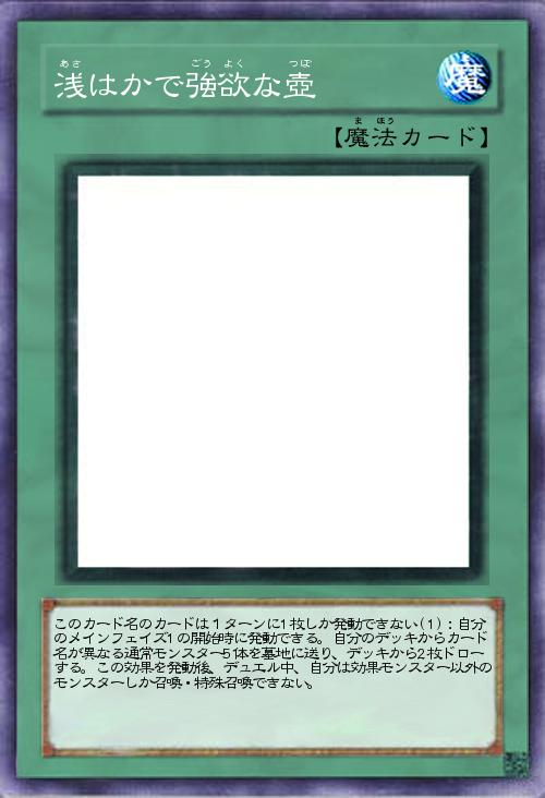 | このカード名のカードは1ターンに1枚しか発動できない(1):自分のメインフェイズ1の開始時に発動できる。自分のデッキからカード名が異なる通常モンスター5体を墓地に送り、デッキから2枚ドローする。この効果を発動後、デュエル中、自分は効果モンスター以外のモンスターしか召喚・特殊召喚できない。 | |||