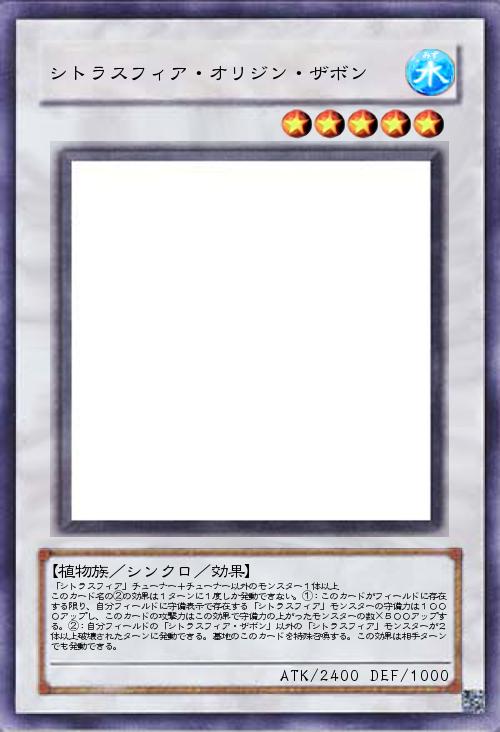 | 「シトラスフィア」チューナー+チューナー以外のモンスター1体以上 このカード名の②の効果は1ターンに1度しか発動できない。①:このカードがフィールドに存在する限り、自分フィールドに守備表示で存在する「シトラスフィア」モンスターの守備力は1000アップし、このカードの攻撃力はこの効果で守備力の上がったモンスターの数×500アップする。②:自分フィールドの「シトラスフィア・ザボン」以外の「シトラスフィア」モンスターが2体以上破壊されたターンに発動できる。墓地のこのカードを特殊召喚する。この効果は相手ターンでも発動できる。 | |||