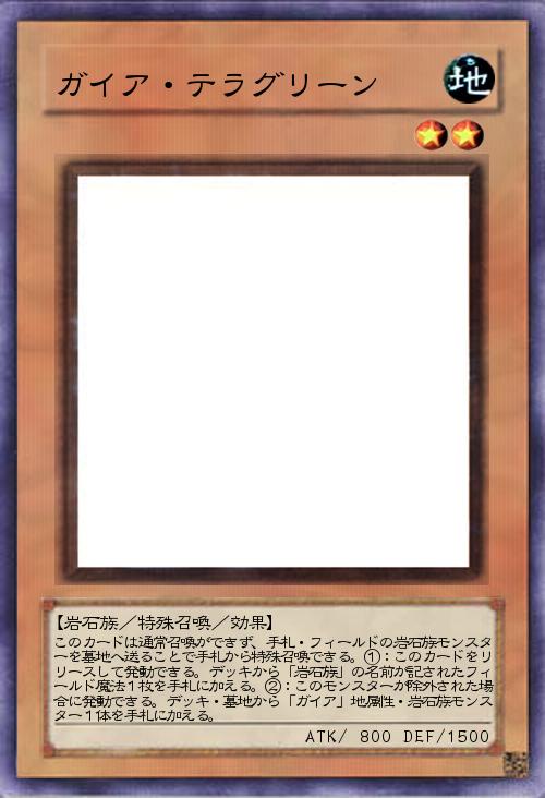 | このカードは通常召喚ができず、手札・フィールドの岩石族モンスターを墓地へ送ることで手札から特殊召喚できる。①:このカードをリリースして発動できる。デッキから「岩石族」の名前が記されたフィールド魔法1枚を手札に加える。②:このモンスターが除外された場合に発動できる。デッキ・墓地から「ガイア」地属性・岩石族モンスター1体を手札に加える。 | |||