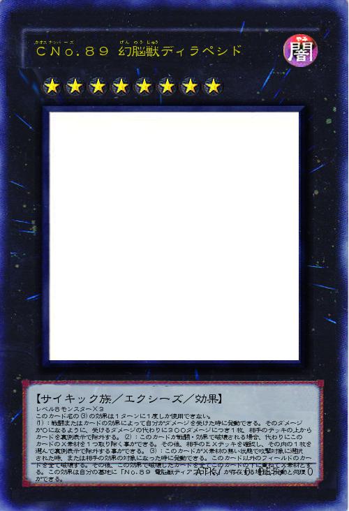 | レベル8モンスター×3 このカード名の(3)の効果は1ターンに1度しか使用できない。 (1):戦闘またはカードの効果によって自分がダメージを受けた時に発動できる。そのダメージが0になるように、受けるダメージの代わりに300ダメージにつき1枚、相手のデッキの上からカードを裏側表示で除外する。(2):このカードが戦闘・効果で破壊される場合、代わりにこのカードのX素材を1つ取り除く事ができる。その後、相手のEXデッキを確認し、その内の1枚を選んで裏側表示で除外する事ができる。(3):このカードがX素材の無い状態で攻撃対象に選択された時、または相手の効果の対象になった時に発動できる。このカード以外のフィールドのカードを全て破壊する。その後、この効果で破壊したカードを全てこのカードの下に重ねてX素材とする。この効果は自分の墓地に「No.89 電脳獣ディアブロシス」が存在する場合に発動と処理ができる。 | |||