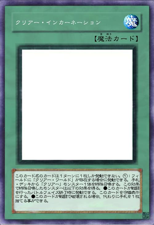 | このカード名のカードは1ターンに1枚しか発動できない。①:フィールドに「クリアー・ワールド」が存在する場合に発動できる。手札・デッキから「クリアー」モンスター1体を特殊召喚する。この効果で特殊召喚したモンスターは以下の効果を得る。●このカードが戦闘を行ったバトルフェイズ終了時に発動できる。このカードを守備表示にする。●このカードが戦闘で破壊される場合、代わりに手札を1枚捨てる事ができる。 | |||