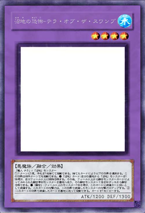 | 「魔人 テラ」+「沼地」モンスター ①:1ターンに1度、手札を1枚捨てて発動できる。捨てたカードにより以下の効果を適用する。この効果は相手ターンでも発動できる。●「沼地」カード:自分の墓地から「沼地」モンスターを1体選び、自分フィールド上に特殊召喚する。その後、フィールド上から融合モンスターカードによって決められた融合素材モンスターを墓地へ送り、その融合モンスター1体をEXデッキから融合召喚できる。●「融合」:フィールド上のモンスター1体を選び、このカードに装備カード扱いとして装備する。このカードの攻撃力は、この効果で装備したモンスターの攻撃力分アップする。②:このカードの効果で装備したカードを墓地に送って発動できる。カードを1枚ドローする。 | |||