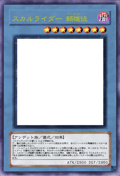 | 「スカルライダーの誓い」により降臨する。 ①:儀式召喚したこのカードがフィールドに存在する限り、自分フィールドの悪魔族モンスターは効果では破壊されない。 ②:バトルフェイズ以外でこのカードが相手カード効果の対象となった場合、デッキから「スカルライダー」を墓地に送り発動する。そのカードの効果を無効にし破壊する。 ③:このカードが戦闘で破壊され墓地に送られた場合、発動できる。墓地から「スカルライダー」1体を召喚条件を無視して特殊召喚する。この効果で特殊召喚したモンスターの攻撃力は2900となる。 | |||