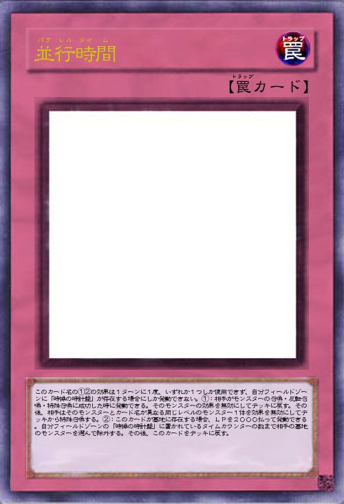 | このカード名の①②の効果は1ターンに1度、いずれか1つしか使用できず、自分フィールドゾーンに「時操の時計盤」が存在する場合にしか発動できない。①:相手がモンスターの召喚・反転召喚・特殊召喚に成功した時に発動できる。そのモンスターの効果を無効にしてデッキに戻す。その後、相手はそのモンスターとカード名が異なる同じレベルのモンスター1体を効果を無効にしてデッキから特殊召喚する。②:このカードが墓地に存在する場合、LPを2000払って発動できる。自分フィールドゾーンの「時操の時計盤」に置かれているタイムカウンターの数まで相手の墓地のモンスターを選んで除外する。その後、このカードをデッキに戻す。 | |||