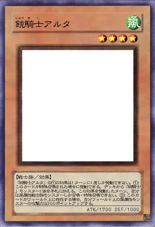 | 「銃騎士アルタ」の①の効果は1ターンに1度しか発動できない。①:このカードが特殊召喚された場合に発動できる。デッキから「銃騎士」モンスター1体を手札に加える。この効果を発動したターン、自分は風属性戦士族モンスターしか召喚・特殊召喚できない。②:このカードがフィールド上に存在する場合、自分フィールド上の風属性モンスターの攻撃力は300ポイントアップする。 | |||