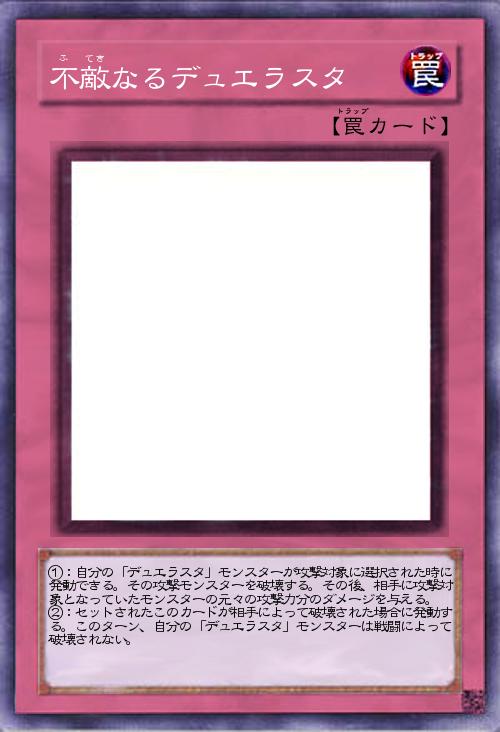 | ①:自分の「デュエラスタ」モンスターが攻撃対象に選択された時に発動できる。その攻撃モンスターを破壊する。その後、相手に攻撃対象となっていたモンスターの元々の攻撃力分のダメージを与える。 ②:セットされたこのカードが相手によって破壊された場合に発動する。このターン、自分の「デュエラスタ」モンスターは戦闘によって破壊されない。 | |||