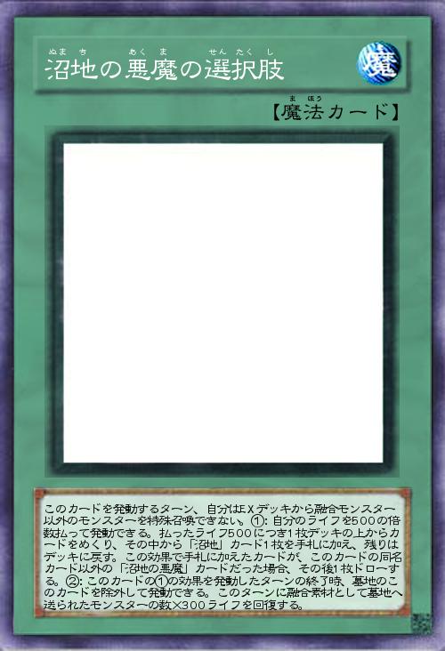 | このカードを発動するターン、自分はEXデッキから融合モンスター以外のモンスターを特殊召喚できない。①:自分のライフを500の倍数払って発動できる。払ったライフ500につき1枚デッキの上からカードをめくり、その中から「沼地」カード1枚を手札に加え、残りはデッキに戻す。この効果で手札に加えたカードが、このカードの同名カード以外の「沼地の悪魔」カードだった場合、その後1枚ドローする。②:このカードの①の効果を発動したターンの終了時、墓地のこのカードを除外して発動できる。このターンに融合素材として墓地へ送られたモンスターの数×300ライフを回復する。 | |||