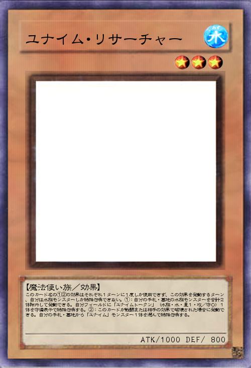 | このカード名の①②の効果はそれぞれ1ターンに1度しか使用できず、この効果を発動するターン、自分は水族モンスターしか特殊召喚できない。①:自分の手札・墓地の水族モンスターを合計2体除外して発動できる。自分フィールドに「ユナイムトークン」(水族・水・星1・攻/守0)1体を守備表示で特殊召喚する。②:このカードが戦闘または相手の効果で破壊された場合に発動できる。自分の手札・墓地から「ユナイム」モンスター1体を選んで特殊召喚する。 | |||