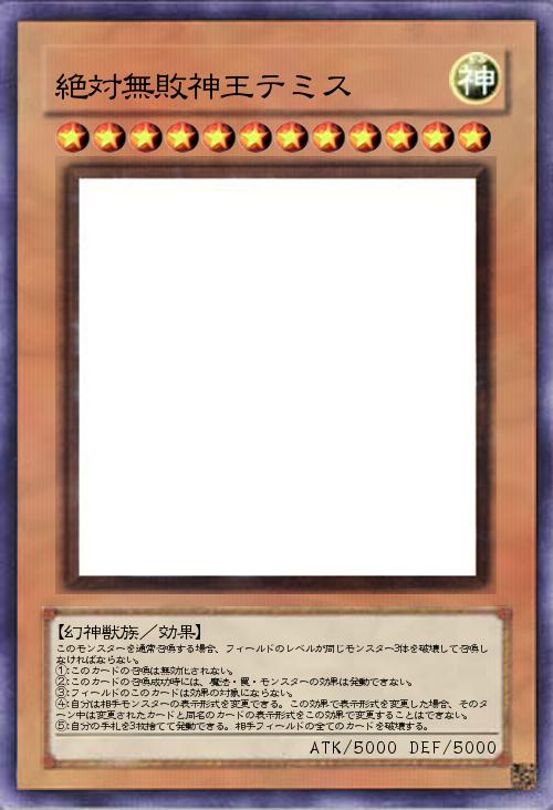 | このモンスターを通常召喚する場合、フィールドのレベルが同じモンスター3体を破壊して召喚しなければならない。 ①:このカードの召喚は無効化されない。 ②:このカードの召喚成功時には、魔法・罠・モンスターの効果は発動できない。 ③:フィールドのこのカードは効果の対象にならない。 ④:自分は相手モンスターの表示形式を変更できる。この効果で表示形式を変更した場合、そのターン中は変更されたカードと同名のカードの表示形式をこの効果で変更することはできない。 ⑤:自分の手札を3枚捨てて発動できる。相手フィールドの全てのカードを破壊する。 | |||