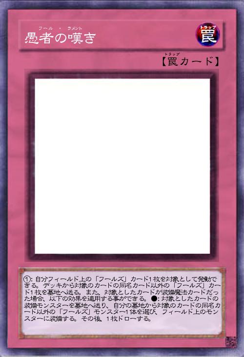 | ①:自分フィールド上の「フールズ」カード1枚を対象として発動できる。デッキから対象のカードの同名カード以外の「フールズ」カード1枚を墓地へ送る。また、対象としたカードが装備魔法カードだった場合、以下の効果を適用する事ができる。●:対象としたカードの装備モンスターを墓地へ送り、自分の墓地から対象のカードの同名カード以外の「フールズ」モンスター1体を選び、フィールド上のモンスターに装備する。その後、1枚ドローする。 | |||