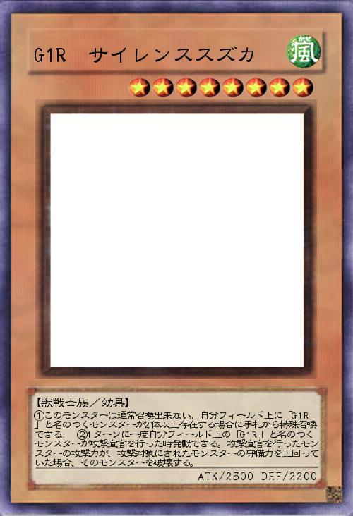 | ①このモンスターは通常召喚出来ない。自分フィールド上に「G1R」と名のつくモンスターが2体以上存在する場合に手札から特殊召喚できる。 ②1ターンに一度自分フィールド上の「G1R」と名のつくモンスターが攻撃宣言を行った時発動できる。攻撃宣言を行ったモンスターの攻撃力が、攻撃対象にされたモンスターの守備力を上回っていた場合、そのモンスターを破壊する。 | |||