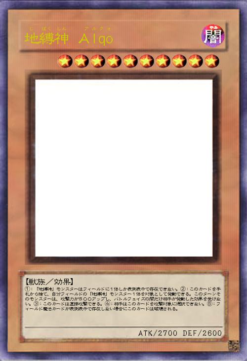 | ①:「地縛神」モンスターはフィールドに1体しか表側表示で存在できない。②:このカードを手札から捨て、自分フィールドの「地縛神」モンスター1体を対象として発動できる。このターンそのモンスターは、攻撃力が500アップし、バトルフェイズの間だけ相手が発動した効果を受けない。③:このカードは直接攻撃できる。④:相手はこのカードを攻撃対象に選択できない。⑤:フィールド魔法カードが表側表示で存在しない場合にこのカードは破壊される。 | |||