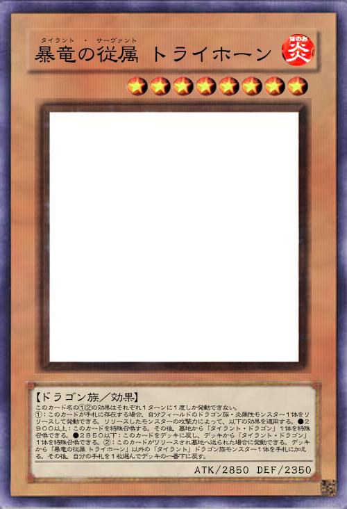 | このカード名の①②の効果はそれぞれ1ターンに1度しか発動できない。 ①:このカードが手札に存在する場合、自分フィールドのドラゴン族・炎属性モンスター1体をリリースして発動できる。リリースしたモンスターの攻撃力によって、以下の効果を適用する。●2900以上:このカードを特殊召喚する。その後、墓地から「タイラント・ドラゴン」1体を特殊召喚できる。●2850以下:このカードをデッキに戻し、デッキから「タイラント・ドラゴン」1体を特殊召喚できる。②:このカードがリリースされ墓地へ送られた場合に発動できる。デッキから「暴竜の従属 トライホーン」以外の「タイラント」ドラゴン族モンスター1体を手札に加える。その後、自分の手札を1枚選んでデッキの一番下に戻す。 | |||