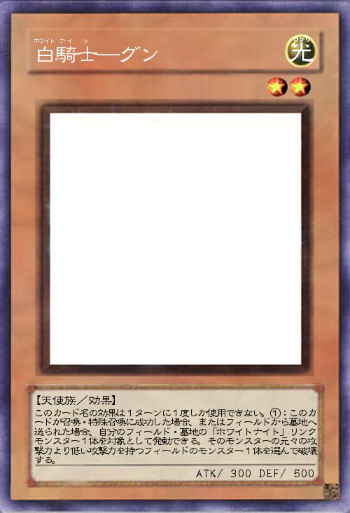 | このカード名の効果は1ターンに1度しか使用できない。①:このカードが召喚・特殊召喚に成功した場合、またはフィールドから墓地へ送られた場合、自分のフィールド・墓地の「ホワイトナイト」リンクモンスター1体を対象として発動できる。そのモンスターの元々の攻撃力より低い攻撃力を持つフィールドのモンスター1体を選んで破壊する。 | |||