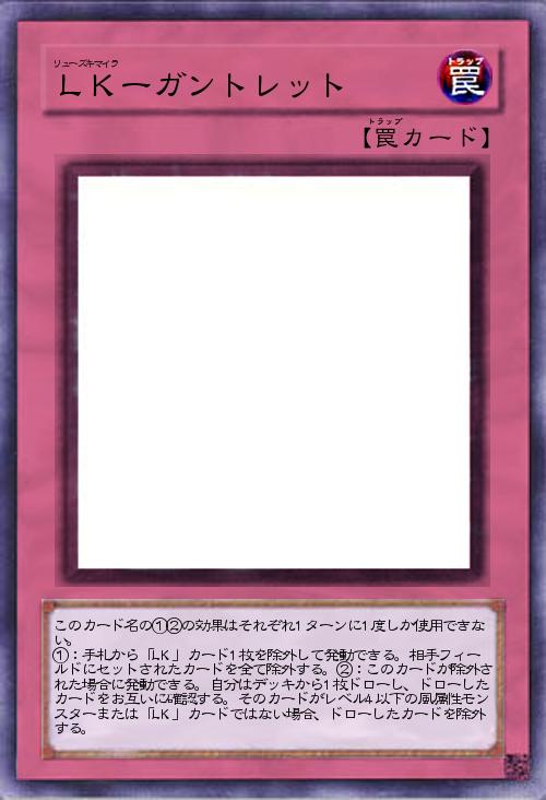 | このカード名の①②の効果はそれぞれ1ターンに1度しか使用できない。 ①:手札から「LK」カード1枚を除外して発動できる。相手フィールドにセットされたカードを全て除外する。②:このカードが除外された場合に発動できる。自分はデッキから1枚ドローし、ドローしたカードをお互いに確認する。そのカードがレベル4以下の風属性モンスターまたは「LK」カードではない場合、ドローしたカードを除外する。 | |||