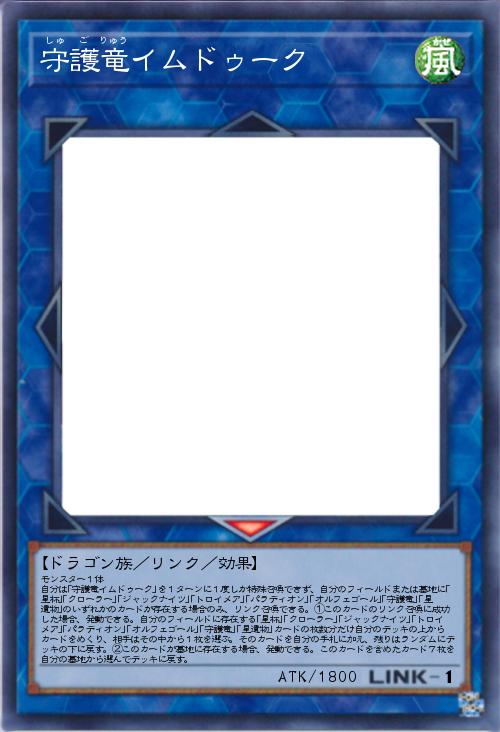 | モンスター1体 自分は「守護竜イムドゥーク」を1ターンに1度しか特殊召喚できず、自分のフィールドまたは墓地に「星杯」「クローラー」「ジャックナイツ」「トロイメア」「パラディオン」「オルフェゴール」「守護竜」「星遺物」のいずれかのカードが存在する場合のみ、リンク召喚できる。①このカードのリンク召喚に成功した場合、発動できる。自分のフィールドに存在する「星杯」「クローラー」「ジャックナイツ」「トロイメア」「パラディオン」「オルフェゴール」「守護竜」「星遺物」カードの枚数分だけ自分のデッキの上からカードをめくり、相手はその中から1枚を選ぶ。そのカードを自分の手札に加え、残りはランダムにデッキの下に戻す。②このカードが墓地に存在する場合、発動できる。このカードを含めたカード7枚を自分の墓地から選んでデッキに戻す。 | |||