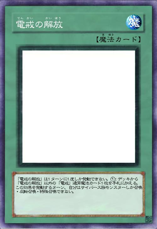 | 「電戒の解放」は1ターンに1度しか発動できない。①:デッキから「電戒の解放」以外の「電戒」通常魔法カード1枚を手札に加える。この効果を発動するターン、自分はサイバース族モンスターしか召喚・反転召喚・特殊召喚できない。 | |||