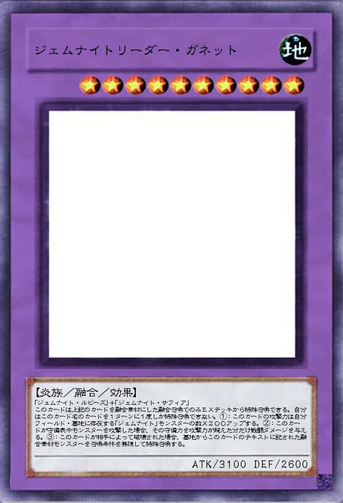 | 「ジェムナイト・ルビーズ」+「ジェムナイト・サフィア」 このカードは上記のカードを融合素材にした融合召喚でのみEXデッキから特殊召喚できる。自分はこのカード名のカードを1ターンに1度しか特殊召喚できない。①:このカードの攻撃力は自分フィールド・墓地に存在する「ジェムナイト」モンスターの数X200アップする。②:このカードが守備表示モンスターを攻撃した場合、その守備力を攻撃力が超えた分だけ戦闘ダメージを与える。③:このカードが相手によって破壊された場合、墓地からこのカードのテキストに記された融合素材モンスターを召喚条件を無視して特殊召喚する。 | |||