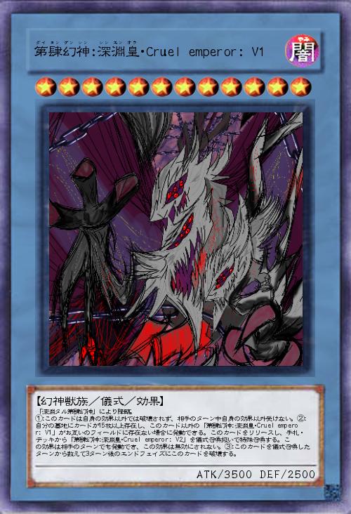| 「深淵タル第肆幻神」により降臨。 ①:このカードは自身の効果以外では破壊されず、相手のターン中自身の効果以外受けない。②:自分の墓地にカードが15枚以上存在し、このカード以外の「第肆幻神:深淵皇・Cruel emperor: V1」がお互いのフィールドに存在ない場合に発動できる。このカードをリリースし、手札・デッキから「第肆幻神:深淵皇・Cruel emperor: V2」を儀式召喚扱いで特殊召喚する。この効果は相手のターンでも発動でき、この効果は無効にされない。③:このカードを儀式召喚したターンから数えて3ターン後のエンドフェイズにこのカードを破壊する。 | |||
