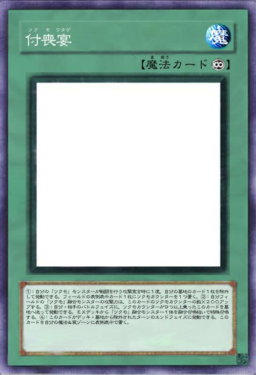 | ①:自分の「ツクモ」モンスターが戦闘を行う攻撃宣言時に1度、自分の墓地のカード1枚を除外して発動できる。フィールドの表側表示カード1枚にツクモカウンターを1つ置く。②:自分フィールドの「ツクモ」融合モンスターの攻撃力は、このカードのツクモカウンターの数×200アップする。③:自分・相手のバトルフェイズに、ツクモカウンターが9つ以上乗ったこのカードを墓地へ送って発動できる。EXデッキから「ツクモ」融合モンスター1体を融合召喚扱いで特殊召喚する。④:このカードがデッキ・墓地から除外されたターンのエンドフェイズに発動できる。このカードを自分の魔法&罠ゾーンに表側表示で置く。 | |||
