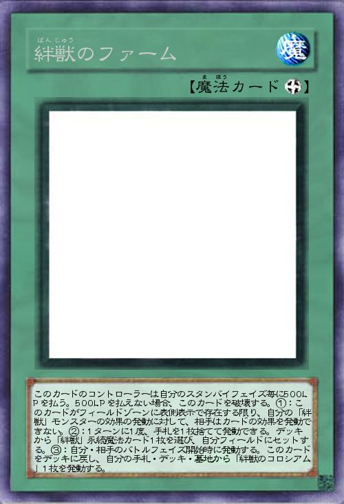 | このカードのコントローラーは自分のスタンバイフェイズ毎に500LPを払う。500LPを払えない場合、このカードを破壊する。①:このカードがフィールドゾーンに表側表示で存在する限り、自分の「絆獣」モンスターの効果の発動に対して、相手はカードの効果を発動できない。②:1ターンに1度、手札を1枚捨てて発動できる。デッキから「絆獣」永続魔法カード1枚を選び、自分フィールドにセットする。③:自分・相手のバトルフェイズ開始時に発動する。このカードをデッキに戻し、自分の手札・デッキ・墓地から「絆獣のコロシアム」1枚を発動する。 | |||