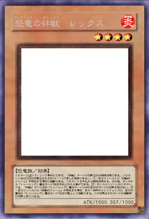 | このカードはS・X・リンク素材にできず、「絆獣」カードの効果でのみ特殊召喚できる。このカード名の①③の効果はそれぞれ1ターンに1度しか使用できない。①:自分フィールドに「絆獣のファーム」が存在する場合に発動できる。このカードを手札から特殊召喚する。その後、デッキから「トレーニング」魔法カード1枚を手札に加える事ができる。②:モンスターゾーンのこのカードは、「絆獣」カード及び「トレーニング」魔法カード以外の自分のカードの効果を受けない。③:自分フィールドに「絆獣のファーム」が存在する場合、自分・相手のメインフェイズに、自分の墓地の「トレーニング」魔法カード1枚を対象として発動できる。この効果はそのカードの発動時の効果と同じになる。 | |||