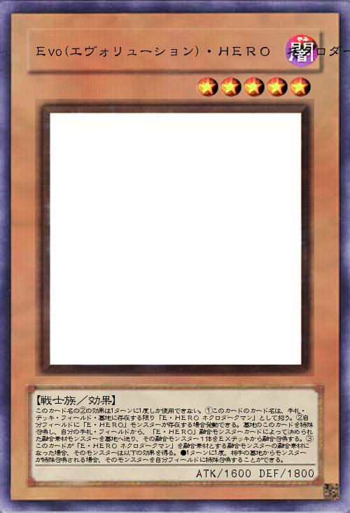 | このカード名の②の効果は1ターンに1度しか使用できない。①このカードのカード名は、手札・デッキ・フィールド・墓地に存在する限り「E・HERO ネクロダークマン」として扱う。②自分フィールドに「E・HERO」モンスターが存在する場合発動できる。墓地のこのカードを特殊召喚し、自分の手札・フィールドから、「E・HERO」融合モンスターカードによって決められた融合素材モンスターを墓地へ送り、その融合モンスター1体をEXデッキから融合召喚する。③このカードが「E・HERO ネクロダークマン」を融合素材とする融合モンスターの融合素材になった場合、そのモンスターは以下の効果を得る。●1ターンに1度、相手の墓地からモンスターが特殊召喚される場合、そのモンスターを自分フィールドに特殊召喚することができる。 | |||