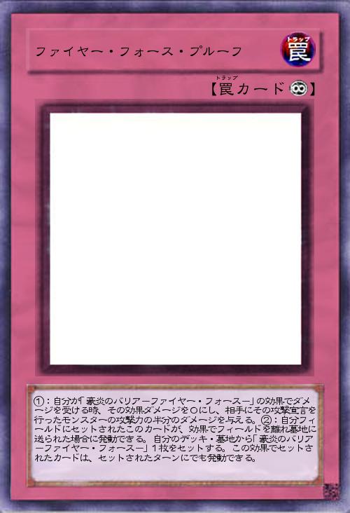 | ①:自分が「豪炎のバリア-ファイヤー・フォース-」の効果でダメージを受ける時、その効果ダメージを0にし、相手にその攻撃宣言を行ったモンスターの攻撃力の半分のダメージを与える。②:自分フィールドにセットされたこのカードが、効果でフィールドを離れ墓地に送られた場合に発動できる。自分のデッキ・墓地から「豪炎のバリア-ファイヤー・フォース-」1枚をセットする。この効果でセットされたカードは、セットされたターンにでも発動できる。 | |||