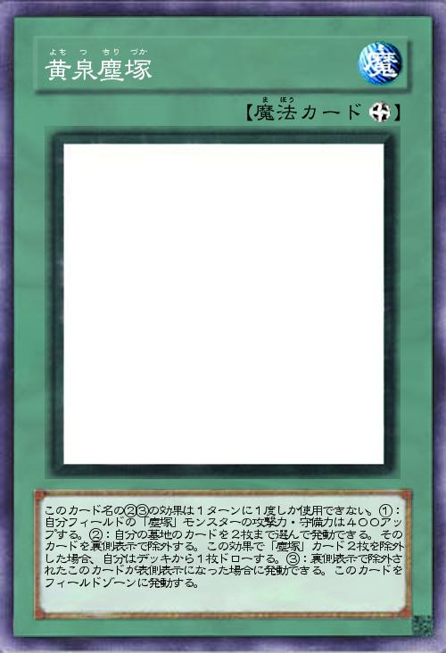| このカード名の②③の効果は1ターンに1度しか使用できない。①:自分フィールドの「塵塚」モンスターの攻撃力・守備力は400アップする。②:自分の墓地のカードを2枚まで選んで発動できる。そのカードを裏側表示で除外する。この効果で「塵塚」カード2枚を除外した場合、自分はデッキから1枚ドローする。③:裏側表示で除外されたこのカードが表側表示になった場合に発動できる。このカードをフィールドゾーンに発動する。 | |||