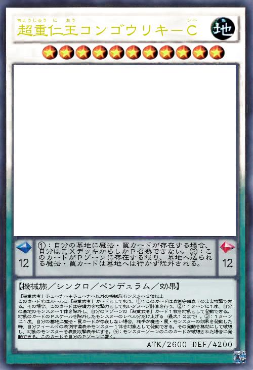 | 「超重武者」チューナー+チューナー以外の機械族モンスター2体以上 このカード名はルール上「超重武者」カードとして扱う。①:このカードは表側守備表示のまま攻撃できる。その場合、このカードは守備力を攻撃力として扱いダメージ計算を行う。②:1ターンに1度、自分の墓地のモンスター1体を除外し、自分のPゾーンの「超重武者」カード1枚を対象として発動できる。対象のカードのPスケールを除外したモンスターのレベル分だけ上げる(最大12まで)。③:1ターンに1度、自分の墓地に魔法・罠カードが存在しない場合、相手が魔法・罠・モンスターの効果を発動した時、自分フィールドの表側守備表示モンスター1体を対象として発動できる。その発動を無効にして破壊し、対象のモンスターを表側攻撃表示にする。④:モンスターゾーンのこのカードが破壊された場合に発動できる。このカードを自分のPゾーンに置く。 | |||