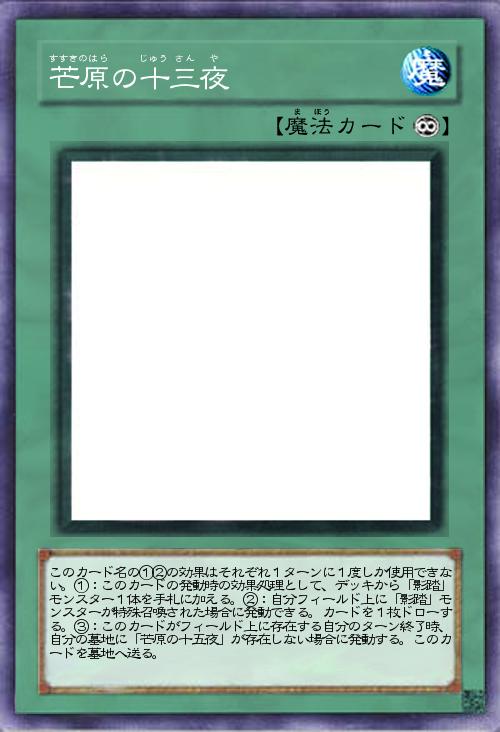 | このカード名の①②の効果はそれぞれ1ターンに1度しか使用できない。①:このカードの発動時の効果処理として、デッキから「影踏」モンスター1体を手札に加える。②:自分フィールド上に「影踏」モンスターが特殊召喚された場合に発動できる。カードを1枚ドローする。③:このカードがフィールド上に存在する自分のターン終了時、自分の墓地に「芒原の十五夜」が存在しない場合に発動する。このカードを墓地へ送る。 | |||