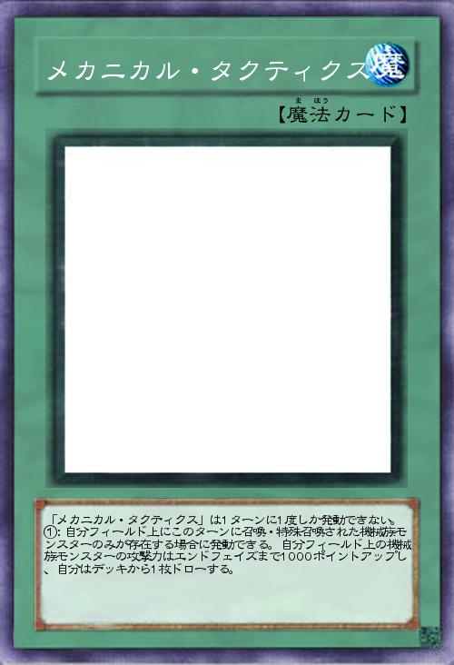 | 「メカニカル・タクティクス」は1ターンに1度しか発動できない。①:自分フィールド上にこのターンに召喚・特殊召喚された機械族モンスターのみが存在する場合に発動できる。自分フィールド上の機械族モンスターの攻撃力はエンドフェイズまで1000ポイントアップし、自分はデッキから1枚ドローする。 | |||